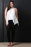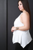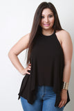 This plus size top features a ribbed knit fabrication, high neck design, sleeveless construction, and asymmetrical sharkbite hemline. Accessories sold separately. Made in U.S.A. 95% Rayon, 5% Spandex.
