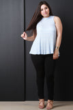 This striped accent, mock neck, sleeveless design, and high-low flare hemline. Accessories sold separately. Made in U.S.A. 75.8% Rayon, 18.2% Polyester, 3% Spandex.