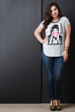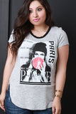 This plus size top features a rounded contrast neckline, short sleeves, a graphic print picture of a girl that reads " Paris, May Every Sunrise Hold More Promise, And every Sunset Hold More Peace", with a curved hemline and soft knit fabrication. Accessories sold separately. 49% Rayon 47% Polyester 4% Spandex. Contrast: 97% Rayon 3% Spandex.