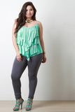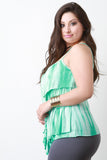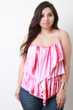 This plus size top features a tie dye jersey knit fabrication, spaghetti shoulder straps, scoop neckline and back, tiered ruffles at front, and asymmetrical hemline. Accessories sold separately. Made in U.S.A. 95% Rayon, 5% Spandex.