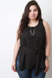This plus size top features a flowy knit fabrication, round neckline, sleeveless construction, and self-tie sash closure at waist. Finished with two side slits. Accessories sold separately. Made in U.S.A. 100% Polyester.