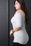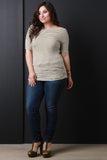 This plus size top features stripes design, ribbed knit fabrication, off shoulder bardot neckline, and elbow sleeves construction. Finished with cinched side detail rounded hemline. Accessories sold separately. Made in U.S.A. 95% Rayon, 5% Spandex.