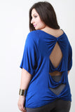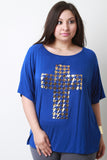 This plus size top features a soft knit fabrication, round neckline, short dolman sleeves, cross print at front, and quadruple cutout bow design at the back. Accessories sold separately. Made in U.S.A. 97% Rayon, 3% Spandex.