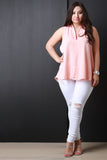 This plus size top features a deep v-neckline, flowy knit fabrication, sleeveless construction, and cinched shoulder and back details. Finished with a slight high low hemline. Accessories sold separately. Made in U.S.A. 100% Polyester.
