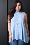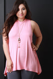 This top features a soft jersey knit fabrication, mock neckline, sleeveless construction, sharkbite hemline, and includes a necklace. Other Accessories sold separately. Made in U.S.A. 95% Rayon, 5% Spandex.