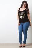 This plus size top features a foil gold "wild spirit" design, cross back double spaghetti straps, elastic back with a soft knit fabrication. Accessories sold separately. Made in U.S.A. 95% Rayon, 5% Spandex.