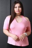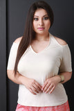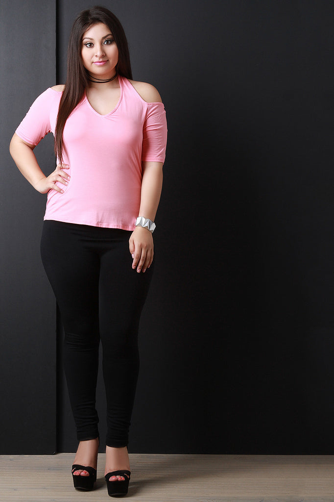 This cute top features a cols shoulder design, v neckline, halter straps, half sleeves, and a soft knit fabrication. Accessories sold separately. Made in U.S.A. 95% Rayon, 5% Spandex.
