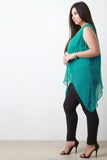 This plus size top features a woven knit fabrication, detailed round neckline with beads, sleeveless fit, and finished with an asymmetrical wrapped hemline. Accessories sold separately. 100% Polyester.