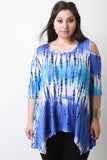 This cute plus size top features a jersey knit fabrication, scoop neckline, cold shoulder design, and elbow length sleeves. Finished with a sharkbite hemline. Accessories sold separately. Made in U.S.A. 97% Rayon, 3% Spandex.