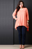 This plus size top has a v-neckline with quarter sleeves, featuring a back stitching detail. Flowy silhouette. Sharkbite hemline. Accessories sold separately. 87% Polyester. 10% Rayon. 3% Spandex.