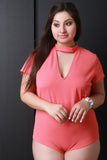 This plus size bodysuit features a mock neckline, front and back deep v cut outs, short sleeves, knit fabrication, button closure at nape, and double snap closure at crotch. Accessories sold separately. Made in U.S.A. 95% Polyester, 5% Spandex.