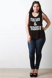 This plus size casual top is sleeveless design with a scooped neckline and dropped armhole. Curved hemline. Finished with print "Tacos & Tequila". Accessories sold separately. 97% Rayon. 3% Spandex.