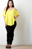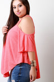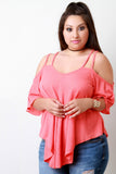 This plus size top features a textured woven knit fabrication, v-neckline, cold shoulder with double straps detail, elbow sleeves, and rounded hemline. Finished with a ruffled trim and design. Accessories sold separately. Made in U.S.A. 98% Polyester, 2% Spandex.