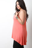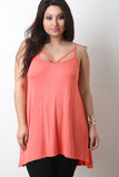 This plus size top features a jersey knit fabrication, scoop neckline with a v-strap design, spaghetti strap, and finished with a high-low hemline. Accessories sold separately. Made in U.S.A. 95% Rayon, 5% Spandex.