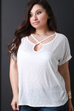 This plus size top features a cross strap key hole neckline, short dolman sleeves, a loose relaxed fit and a thin knit fabrication. Accessories sold separately. Made in U.S.A. 100% Rayon.
