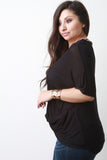 This plus size top features a v neckline, twisted slit front design, deep v back with a strap across, dolman sleeves, and asymmetrical hemline. Accessories sold separately. Made in U.S.A. 87% Polyester, 10% Rayon, 3% Spandex.