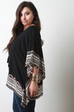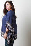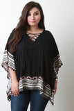 This relaxed fit plus size top features a solid knit fabrication with contrasting patterned prints, v-neckline, lace-up design, and kimono sleeves construction. Finished with an asymmetrical hemline. Accessories sold separately. 100% Rayon.
