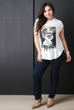 This plus size top features a jersey knit fabrication, round neckline, a graphic print of a fashion girl and reads "Style in the city!" with some gold metallic finish, cap sleeve construction, and finished with a rounded hemline. Accessories sold separately. Made in U.S.A. 95% Rayon, 5% Spandex.