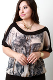 This plus size top features a chiffon fabrication with contrasting solid trim, tropical print, short dolman sleeves, and cold-shoulder design. Finished with an elasticized hemline. Accessories sold separately. Made in U.S.A. Self: 97% Rayon, 3% Spandex. Contrast: 100% Polyester.