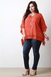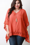 This plus size top features a v-neckline to a center pinch stitch design, kimono sleeves and crochet lace trimming. Accessories sold separately. 95% Rayon, 5% Polyester.