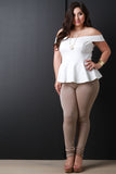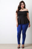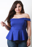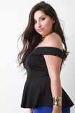 This plus size top features a kniw fabrication, off the shoulder neckline, arm band sleeves, and a flare peplum design. Accessories sold separately. Made in U.S.A. 66% Rayon, 30% Nylon, 4% Spandex.