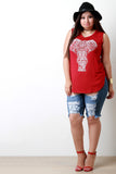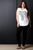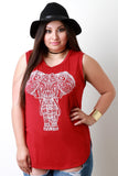 This plus size top features a jersey knit fabrication, tribal elephant graphic print, round neckline, and sleeveless fit. Finished with a rounded hemline. Accessories sold separately. Made in U.S.A. 97% Rayon, 3% Spandex.