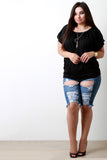 This plus size top features a texturized knit fabrication, boat neckline, cold shoulder, short dolman sleeves, and includes a necklace. Finished with a wide elasticized band hemline with cinched sides. Other accessories sold separately. Made in U.S.A. 96% Polyester, 4% Spandex.