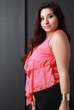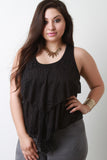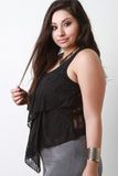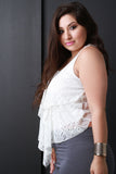 This plus size tank top features a scoop neckline, geometric stretch lace fabrication, semi sheer back, double layer pointed hem front. Accessories sold separately. Made in U.S.A. 60% Polyester, 40% Nylon.