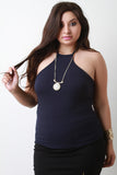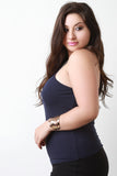 This plus size tank top features a soft rib knit fabrication, high apron style neckline, spaghetti straps, racerback style and a fitted silhouette. Accessories sold separately.Made in U.S.A. 95% Rayon, 5% Spandex.