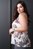 This plus size top features a loose knit with models graphic prints, racer back tank top design, scoop neckline, and curved hemline. Accessories sold separately. Made in U.S.A. 88% Rayon, 12% Polyester .
