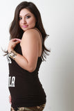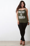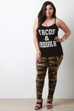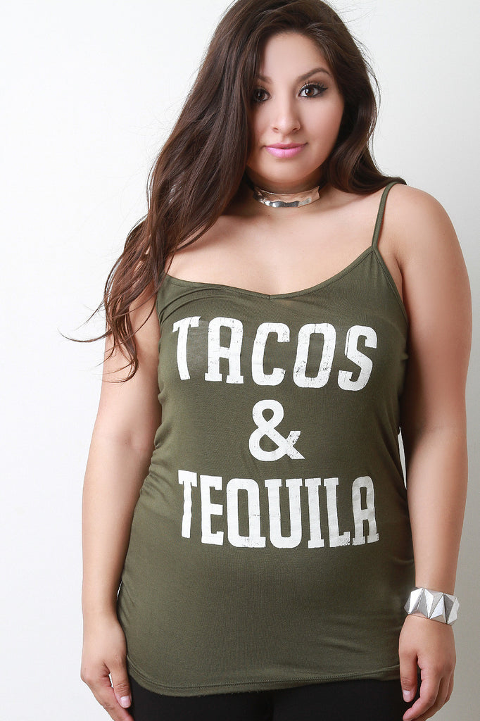 This plus size cami top features a jersey knit fabrication with "Tacos & Tequila" graphic print at front, scooped neck with spaghetti shoulder straps, and side ruched detail. Accessories sold separately. 95% Rayon, 5% Spandex.