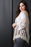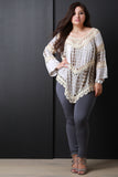 This plus size blouse top features a textured tie-dye knit with semi-sheer crochet panels, v-neckline, long bell sleeves, and angle hem. Accessories sold separately. 35% Acrylic, 65% Polyester.