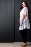 This plus size cover up kimono features a crochet trimmed lace fabrication, short sleeves fit, open front, and elasticized waist with self-tie drawstrings. Accessories sold separately. Made in U.S.A. 100% Nylon.