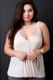This simple plus size top features a rib knitting fabric, deep v-neckline, crossover drape design, and thin flat shoulder straps. Finished with a high-low hemline. Accessories sold separately. Made in U.S.A. 100% Rayon.