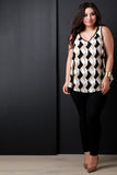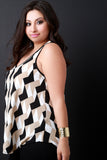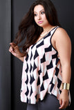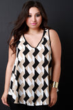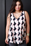 This plus size top features a flowy knit fabrication, contrasting geometrical patten print, v-neckline, and sleeveless fit. Finished with a rounded hemline and T-strap back detail. Accessories sold separately. Made in U.S.A. 100% Polyester.