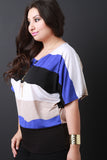 This plus size blouse features a scooped neckline, dolman sleeves, and wide banded hem. Top comes with gemstones and hoop necklace. Other accessories sold separately. Made in U.S.A. 90% Polyester, 10% Spandex. Contrast: 97% Rayon, 3% Spandex.