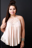 This cutesy plus size top features a woven fabrication, crochet lace insets and trim, rounded neckline, and thin shoulder straps. Finished with a raceback and rounded hemline. Accessories sold separately. Self: 100% Polyester. Contrast: 100% Cotton.