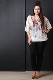 This plus size loose knit top features a peacock features print design, scoop neckline, dolman sleeves, and wide banded hemline. Top comes with double layered feather pendant necklace. Other accessories sold separately. 88% Rayon, 12% Polyester.