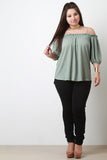 This plus size top features and elastic off the shoulder neckline, spaghetti straps textured woven fabrication, half sleeves, elastic sleeves and a flowing flare cut hem for a looses relaxed fit. Accessories sold separately. 96% Polyester, 4% Spandex.