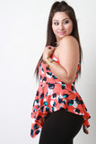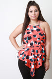 This chic plus size top features a rounded neckline, spaghetti straps, textured knit fabrication, abstract tulip print, cross back keyhole, peplum cut, with a pointed asymmetrical hemline. Accessories sold separately. Made in U.S.A. 96% Polyester 4% Spandex.
