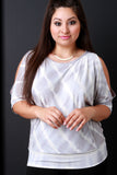 This plus size top features a jersey knit fabric, tie dye print in an angled-stripe pattern, cold shoulder opening sleeves, and a banded hemline. Accessories sold separately. Made in U.S.A. 97% Rayon, 3% Spandex.