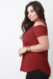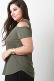 This breezy plus size top features a strappy v neckline, short sleeves with cold shoulder cutouts, and curved hem. Accessories sold separately. 96% Polyester, 4% Spandex.