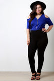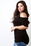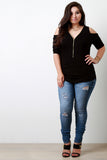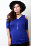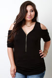 This plus size top features a jersey knit fabrication, zipper-detailed v-neckline, cold shoulder construction, and elbow sleeves. Finished with a side ruching detail. Accessoreis sold separately. Made in U.S.A. 96% Rayon, 4% Spandex.
