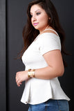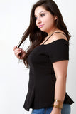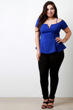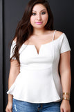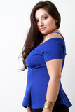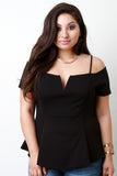 This plus size top features a textured knit fabrication, wired v-neckline, cold shoulder with thin shoulder straps, and flared hemline. Accessories sold separately. Made in U.S.A. Self: 95% Polyester, 5% Spandex. Lining: 100% Polyester.