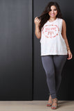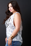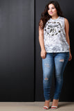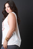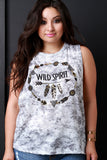 This casual plus size tank top features a knit fabrication, tie dye print, with a "Wild Spirit" graphic print, scoop neckline, low cut armholes and a loose relaxed fit. Accessories sold separately. Made in U.S.A. 95% Polyester 5% Spandex.