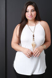 This plus size soft knit top is trapeze silhouette, featuring a ribbed design with a curved high slits hemline. Flare cut. Unlined. Sleeveless with a round neckline. Top includes feather necklace, other accessories sold separately. 95% Rayon. 5% Spandex,