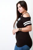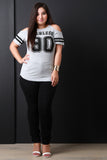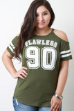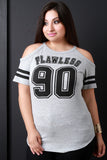 This varsity-styled plus size t-shirt features a jersey knit fabric, team flawless number 90 graphic print, cold shoulder construction, and double striped short sleeves. Finished with a rounded hemline. Accessories sold separately. Made in U.S.A. 97% Rayon, 3% Spandex.