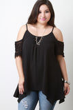 This stylish plus size top features a textured woven fabric, cold shoulder design, short crochet lace sleeves, scoop neckline, gather details and shark-bite hemline. Accessories sold separately. Made in U.S.A. 100% Polyester.