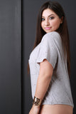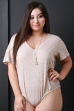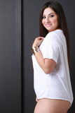 This plus size bodysuit features distressed jersey knit, deep v-neckline, short sleeves, left breast pocket, and snap button closure at crotch for easy on/off. Accessories sold separately. Made in USA. 100% Cotton.
