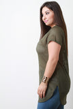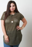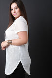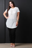 This plus size top features laser cut perforated fabric, round neckline, short sleeves, and curved hem. Accessories sold separately. 93% Polyester, 7% Spandex.